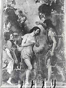 Prima del restauro attualmente in corso (ottobre 1990) la grande tela col Battesimo di Cristo si trovava collocata nella Compagnia. Non vi sono però elementi sufficienti per ritenere che questa fosse la sua collocazione originaria. E’ stata proprio un’identificazione di questo dipinto con uno della serie di quadri con Storie del Battista documentati nel 1755 in Compagnia poi alienati e dispersi nel 1785 durante il periodo delle soppressioni leopoldine (cfr. Vannucchi, 1978, p. 14 e 17 e Mannini, 1990, pp. 19-20). Se non si può escludere che il seicentesco Battesimo di Cristo sia una delle opere scampate alle spoliazioni di quel periodo, sembra però più probabile che esso sia da identificare con un dipinto col Battesimo di Gesù nel Giordano citato dagli inventari ottocenteschi (Rondoni, 1863 e Carocci, 1889) posto in chiesa al primo altare di sinistra entrando, vicino ad un antico fonte battesimale del XVI secolo. Il coperchio di questo fonte viene ricordato come opera di particolare interesse: “in legno noce abilmente intagliato con ornati a mezzo rilievo e stemmi ripetuti di una famiglia Martini” (Rondoni, 1863). Tale notizia ben si accorda con quella riferita dal Calzolai (1966, p. 75) secondo cui il Pievano Pietro di Francesco Martini aveva commissionato un dipinto presso il fonte battesimale. Riunendo dunque i diversi elementi si può dire che il Pievano Martini committente della decorazione della cappella dedicata al Nome di Gesù, commissionò anche una “tavola” (come spesso venivano chiamati i dipinti di grandi dimensioni indipendentemente dal tipo di supporto usato) per l’altare posto vicino al fonte battesimale il cui coperchio recando gli stemmi Martini indicava una donazione della famiglia, (patrona della Pieve insieme ai Venturi) se non del Pievano stesso. Il Battesimo di Cristo rimase al primo altare di sinistra fino alla fine dell’Ottocento. Poi i successivi mutamenti subiti dalla chiesa e i numerosi spostamenti di opere mobili coinvolsero anche questo dipinto che venne allontanato dalla sua originaria collocazione.